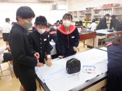 近頃、6年生が家庭室でミシンに向かって、グループで1つのものを作っています。