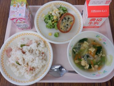 ハムピラフ、花野菜サラダ、グラタン、卵スープ、ケーキという豪華なメニューです。