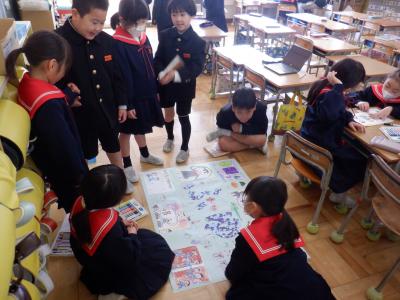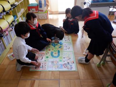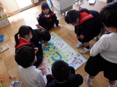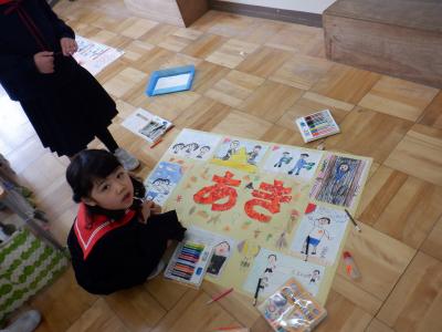 「春と言えば・・・?」など、季節の行事や特徴的な食べ物などを考え、協力して絵に表していました。