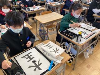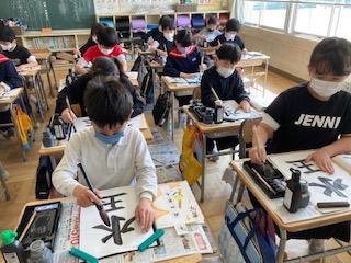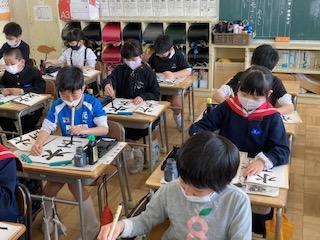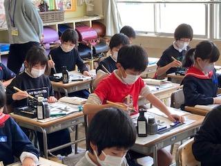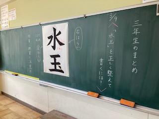 2023年3月14日 12時30分先週3年2組の子ども達が、書写のまとめとしての最後の課題「水玉」の練習をしていました。今年度初めて毛筆にチャレンジした3年生ですが、学んだ「はね・とめ・はらい」などの筆使いに気を付けながら、集中して取り組んでいました。