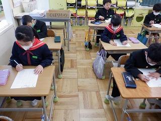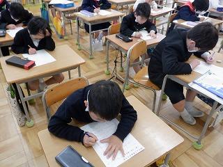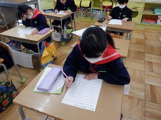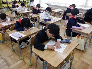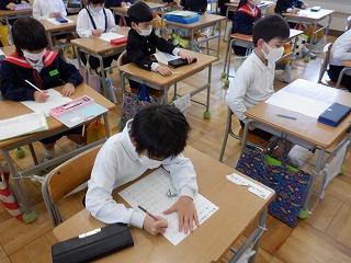 2月たし算・ひき算の校長先生検定に頑張った1年生。3月に入り、更なる計算力アップを目指して、毎朝校長先生テストに挑戦しています。20問に3分間で正しく答えなければならないので、子ども達は、100点めざして集中してがんばっています!
