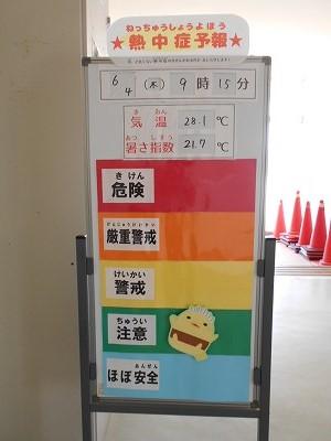 運動場出入り口に熱中症予報掲示板が登場しました。