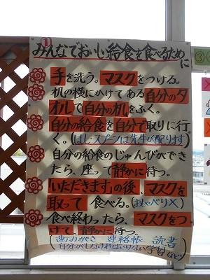給食は簡易給食から通常の給食となりました。配膳等はより一層、気遣いをする必要があるのですが、温かい汁物があったり、品数が増えたりして、子供たちは嬉しそうです。1年生は、まだ慣れない点もありますが、4月に1日だけ給食を食べて以来なので、無理もありません。焦らず、1人1人にあった量を食べることができるように、見守ります。
