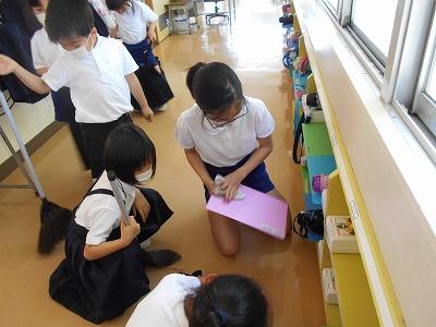 さらに回っていると、1年生の子の水筒が漏れていて、周りの棚がびしょぬれになっていました。それに気づいた6年生が、すぐに上ぶき雑巾を持ってきて、きれいに拭き、1年生を安心させていました。そして「どうして漏れたのかな。」と言って原因を探り、ふたがしっかり閉まっていなかったのを見つけ、しっかり閉めて元に戻しておいてくれました。