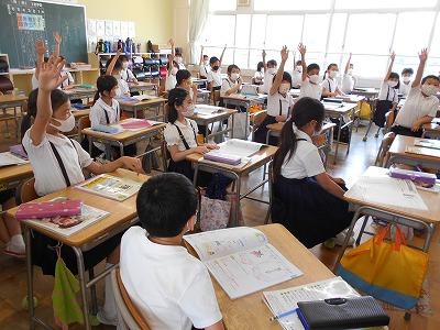 教師の質問に対したくさんの子が挙手していました。