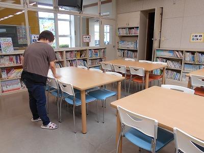 最後に図書室です。大勢の子供たちが使う場所です。机や棚、パソコン回り等を消毒していただきました。