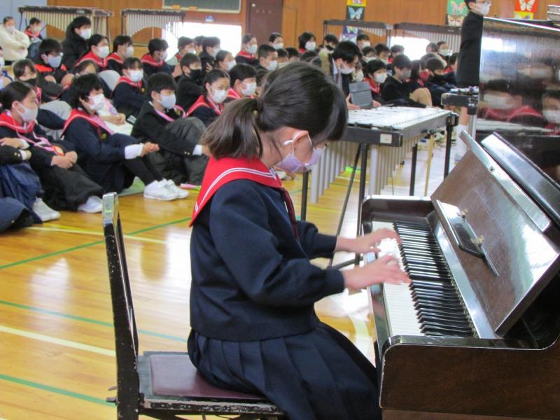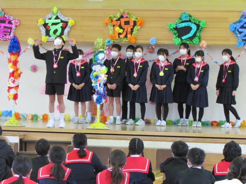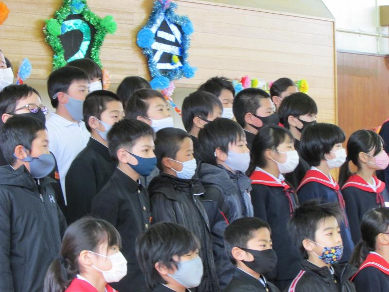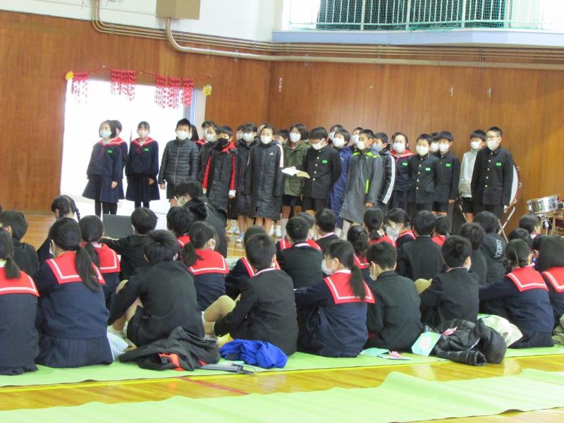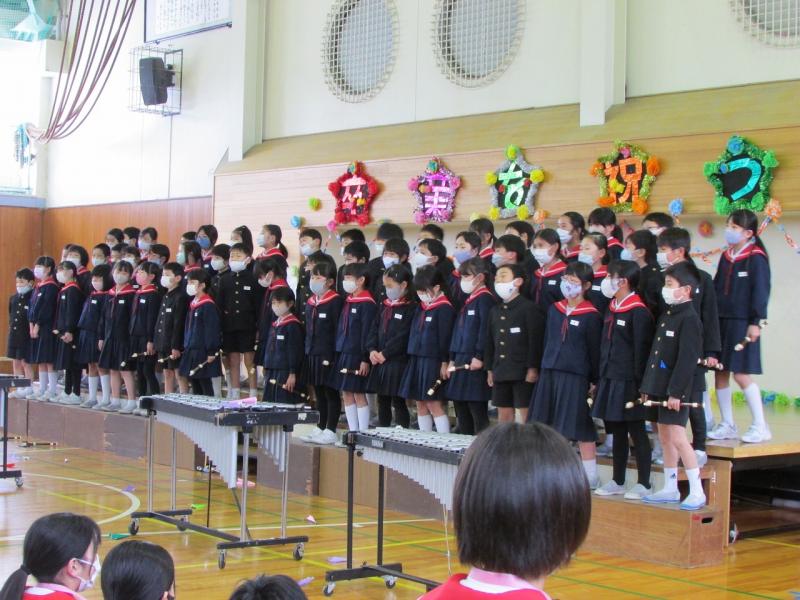 そして6年生。いろいろな楽器を入れて難しい曲に挑戦した合奏は、息がぴったりで「さすが!」と思わせるものでした。続いての「旅立ちの日に」は、卒業式の曲でもあります。今年の卒業式は、1~4年生は参加できないため、聴かせてあげるのはこの祝う会のみです。6年生は、精一杯の気持ちを込めて歌ってくれました。