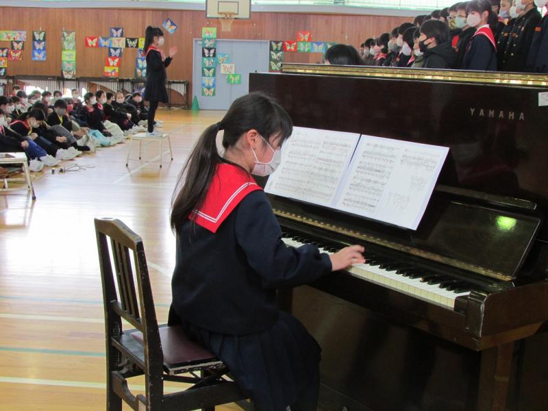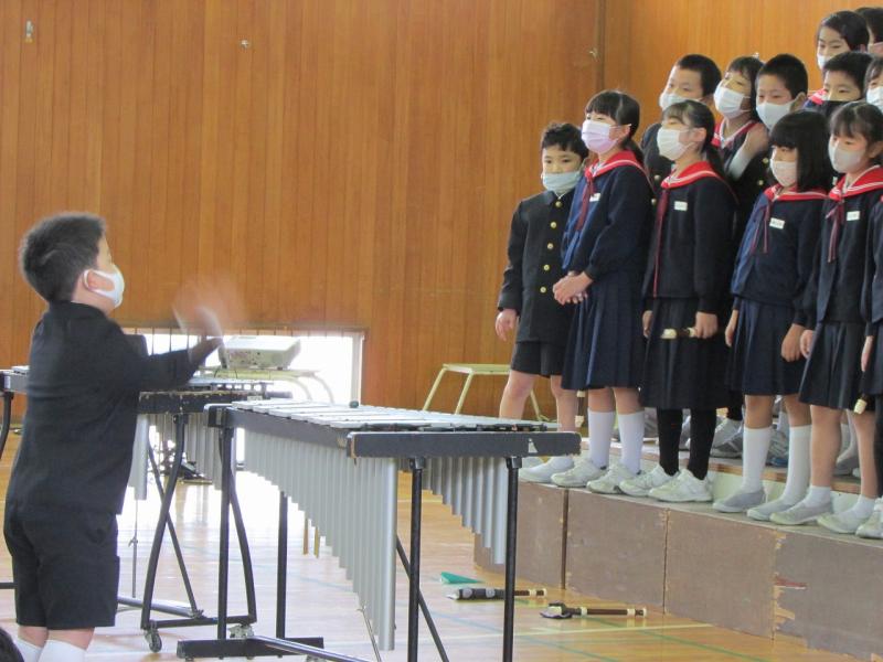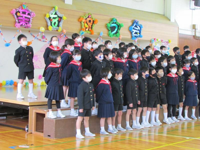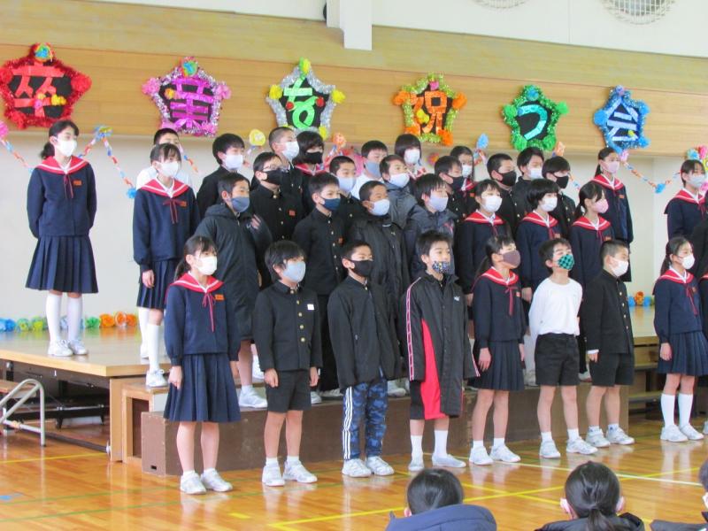 3番手は2年生で「にじ~明日のかけはし~」です。ドレミの歌の替え歌は、6年生への感謝をこめてそれぞれのクラスで作りました。「にじ」の歌には6年生へのエールが込められています。心を込めた歌声に、じ~んとなりました。きっと6年生の心にも響いたと思います。