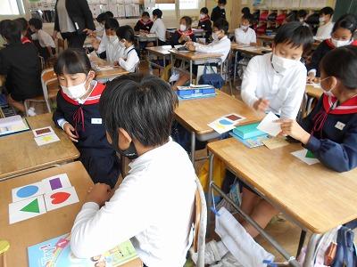 外国語。英語を使ってペア学習。何種類もカードを使いながら話せていました。すごい!
