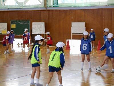 体育。チームごとの作戦で全員シュートをねらいます。ボールのけり方も守りの構えも、きまってますね。