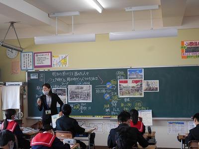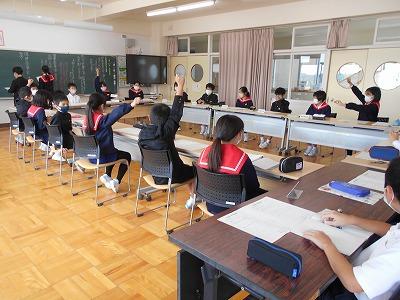社会。複数の資料から見つけたことや考えたことを交流します。資料の見方が深い! さすが6年生。