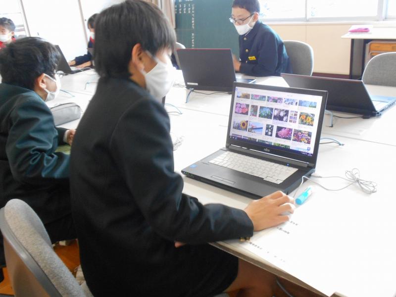 【環境委員会】 花の紹介をしようと決めたようです。パソコン室に行き、花の情報を集めていました。