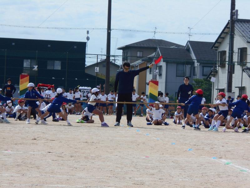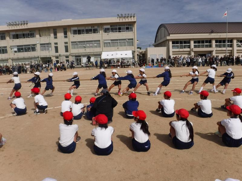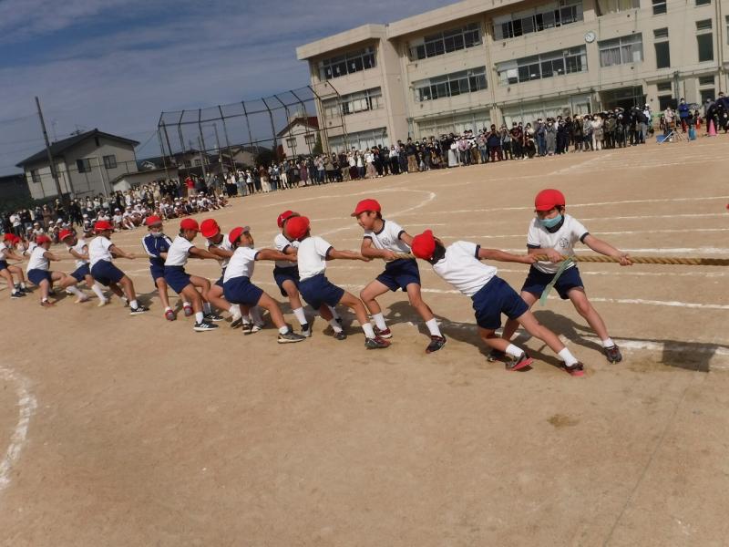 精一杯の力を振り絞り綱を引く3・4年生に今日一番の応援が送られた「踊る 大綱引き戦」、