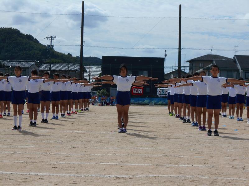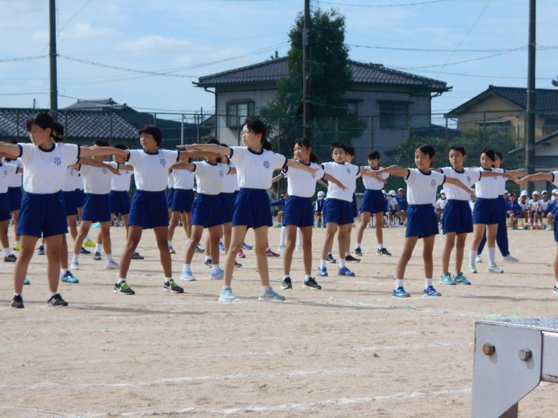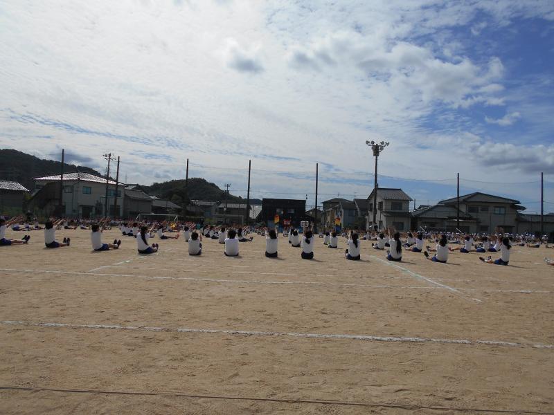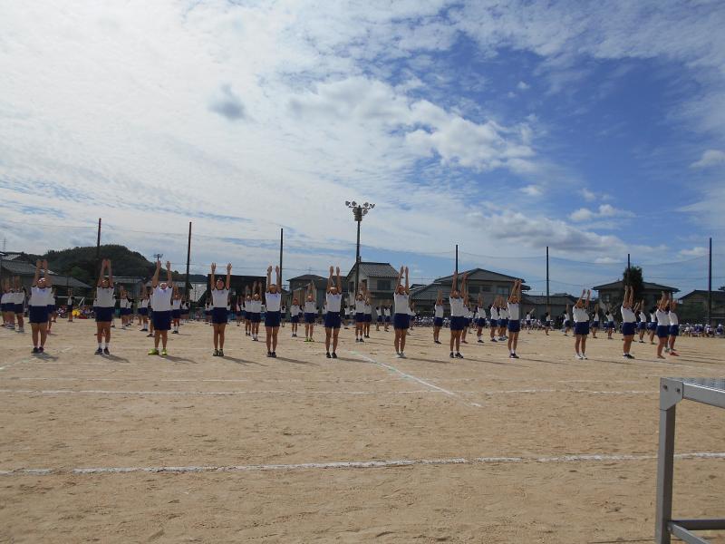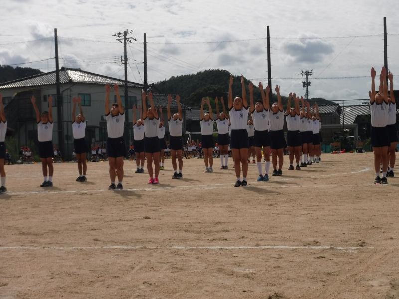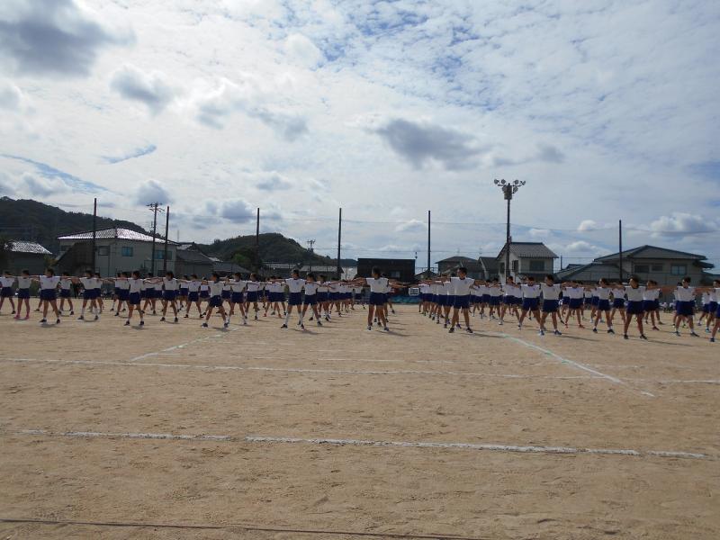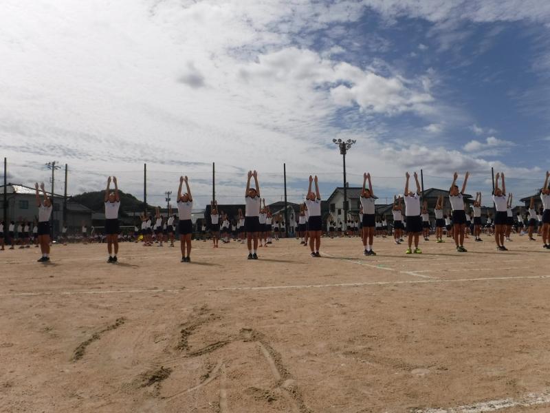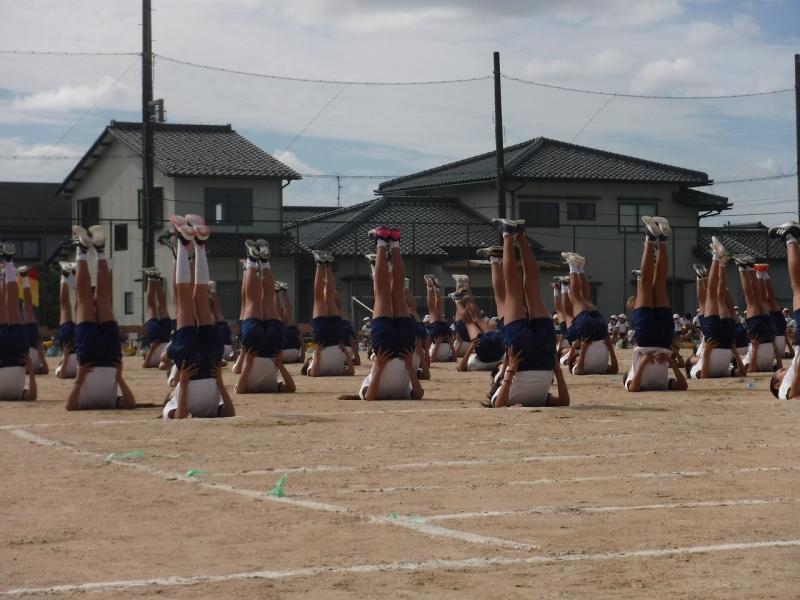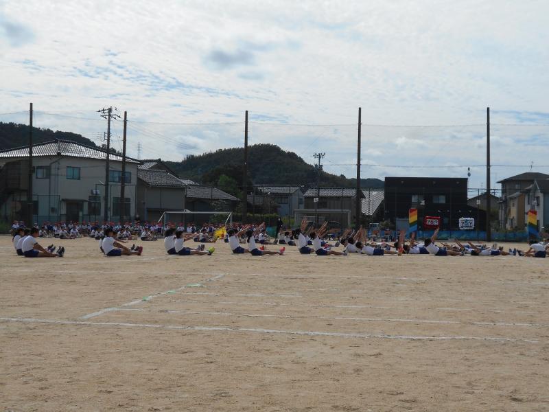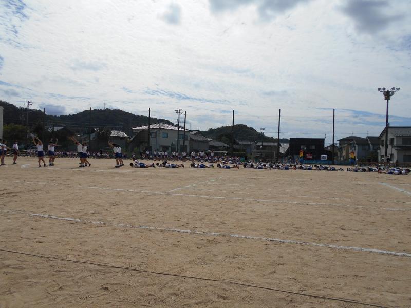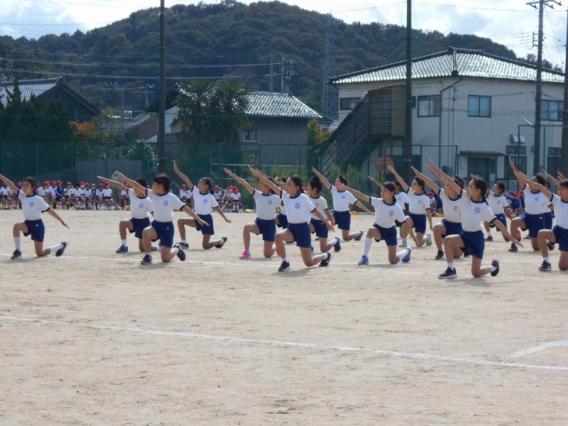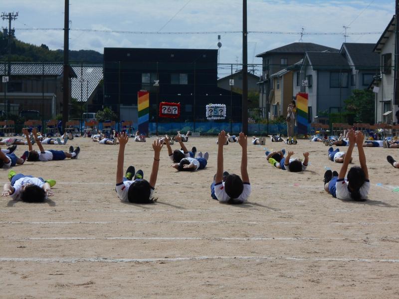 揃った動きの美しさに運動場中がシーンとなり5・6年生を見つめた集団演技「ONE」。