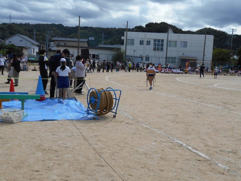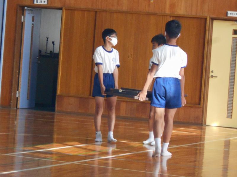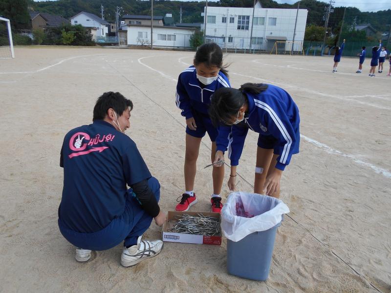 障害走の後は、用具の片付けです。6年生の障害走の後は、5年生の用具係だけで片付けます。