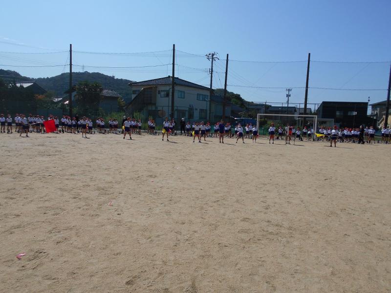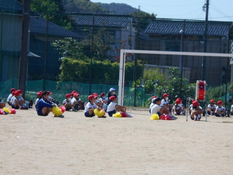 応援団はトラックの中で広がって立ちます。その他の子供たちは自分の座席で応援します。