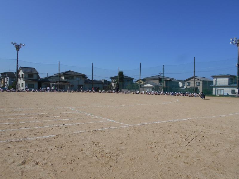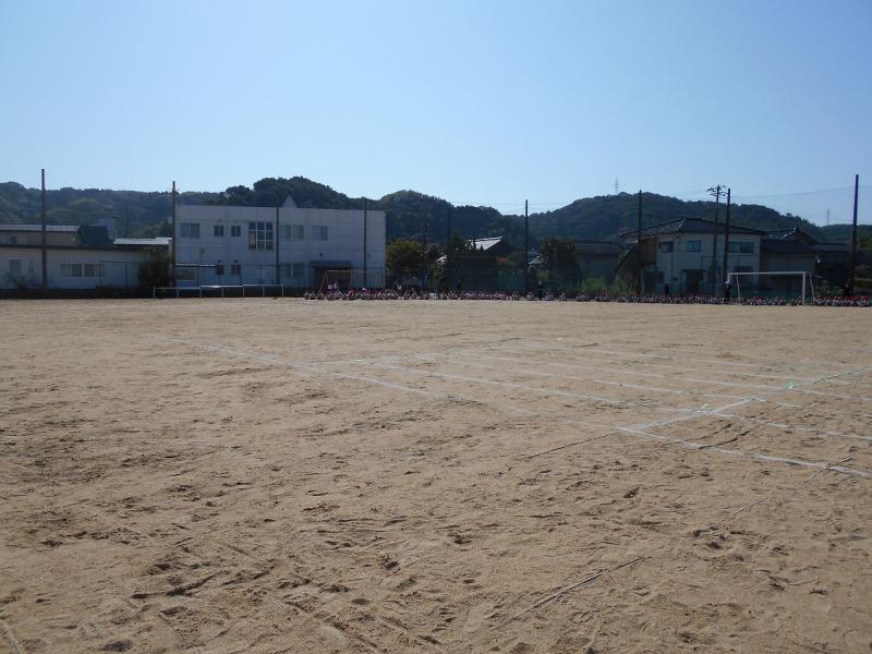 今年の児童席は、一人一人の座席の間隔を1m空けています。それで、いつもの年より2倍ほど児童席が広いです。