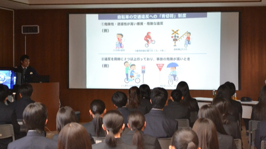 4月22日(水)6限目LHで 大聖寺警察署の交通課より2名をお招きし、交通安全教室を行いました。