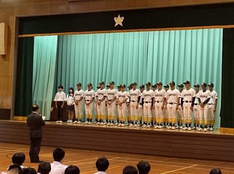 令和7年7月4日(金)期末考査終了後に商業部全国大会・野球部県大会の壮行式が行われました。校長先生と生徒会長の挨拶の後、野球部梅田部長、商業部中西さん、荻田君による決意表明をしました。その後、各クラスの応援団・生徒会執行部が、ステージ上の選手に向けて、元気よく応援していました。