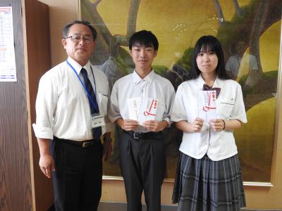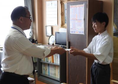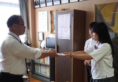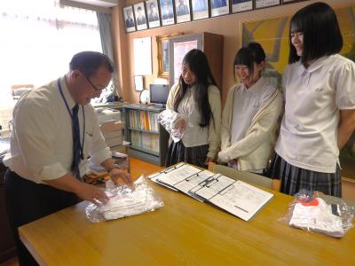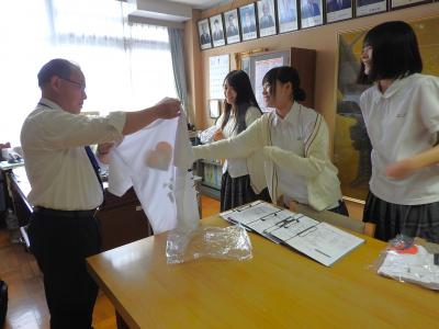 7月14日(月)本校にて、校長先生へ3年生情報ビジネス科マルチメディア活用の授業内でデザインしたTシャツを贈呈しました。