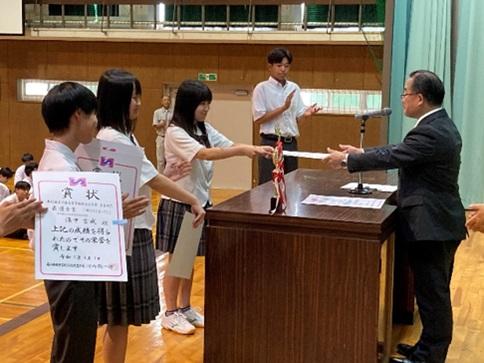 写真部・商業部・柔道部・野球部が受賞し、蓮本校長より賞状・トロフィーを受け取りました。