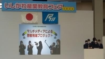 この中で、情報ビジネス科の5人が課題研究で取り組んでいる「専門高校等における産学連携人材育成事業」の中間報告をしました。タイトルは「マルチメディアによる地域観光誘客推進プロジェクト」で、中高生の修学旅行誘致を狙いとする研究でした。また、学校のブースでは、研究発表のプロジェクションマッピングなどマルチメディアを使った加賀市の魅力発信の手法を発表しました。もう一つのブースでは、これまでに商品開発してきたものの販売もしました。