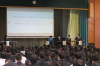 11月3日(水) 6限目に株式会社オリテックから本校卒業生でもある中野様をお招きして全校生徒に社会人として必要な力や後輩へのメッセージを話していただきました。その後、生徒代表2名、教員代表3名、講師中野様の6名でトークセッションを実施しました。生徒代表からの質問を受け講師中野様、教員代表3名のそれぞれが思い思いに、有意義な高校生活を送るためのアドバイスをしてくださりました。この講話、トークセッションから学んだことを今後の学校生活、後々の社会人生活に活かしてほしいと思います。