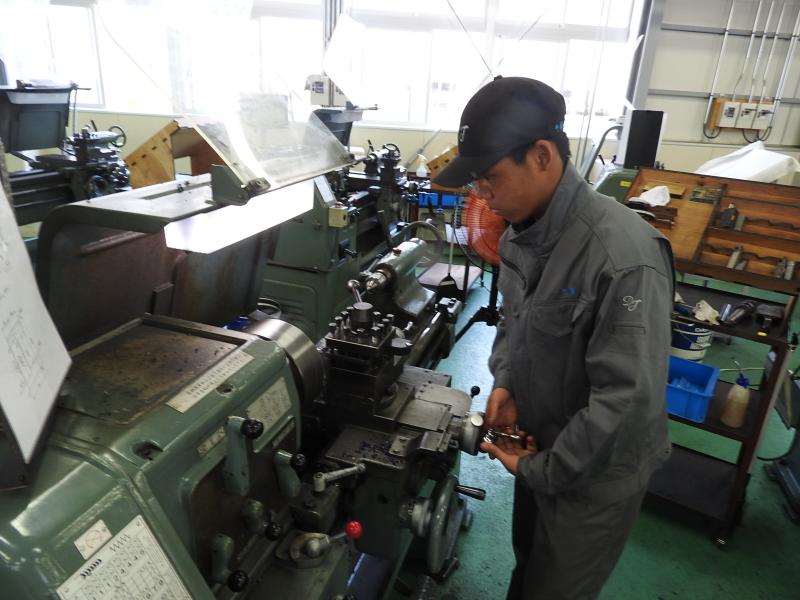 機械システム科2年生で野球部所属の平居君と村口君は、午前のグラウンドでの部活動の後、午後は機械工場で技能検定の実技課題作品の製作に熱心に取り組んでいます。