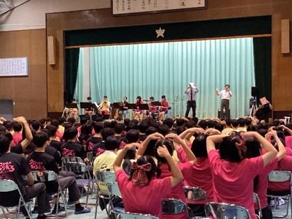 [前半]体育館で吹奏楽部演奏と各クラスの発表があり、大いに盛り上がりました。