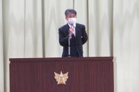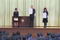 12月23日(水)に表彰披露式と終業式を行いました。表彰披露式では、県新人大会電卓競技団体3位に入賞した商業部代表の中道さん、県高校総体駅伝競技で8位に入賞した陸上部代表の中田さん、手取川流域マラソン大会で優勝した北村さんの表彰披露が行われました。3人それぞれチームメートへの感謝そしてこれからの目標を堂々と話していました。
