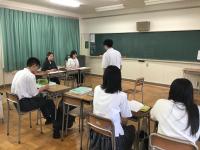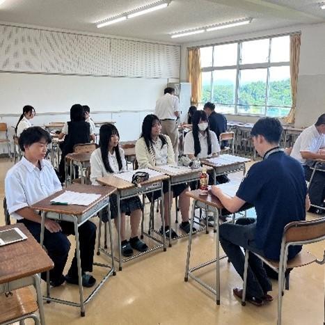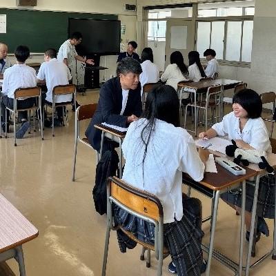 令和7年9月8日(月)の午後、加賀商工会議所様のご紹介で、加賀市内の企業8社および加賀公共職業安定所より講師をお招きして、模擬面接を開催しました。生徒は入退室や質問の応答など本番さながらの緊張感のもと、面接力の向上に励みました。講師の方々からは、適切な受け答えの方法や自己アピールの仕方等ご助言を数多く頂きました。それらを活かして、9月16日(火)より始まる採用選考試験に臨み、希望者全員の進路実現につなげていきたいと思います。講師の皆様、ありがとうございました。