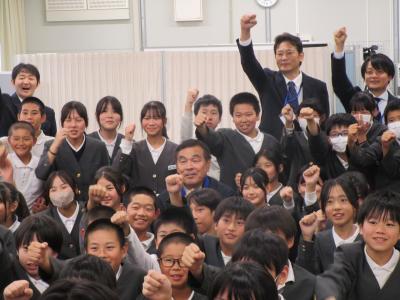 馳知事を会場で待つ6年生は、緊張していたり、ソワソワしていたり…。