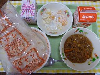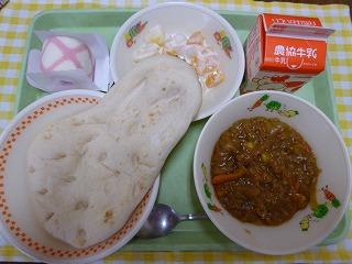 ナン、キーマカレー、フルーツヨーグルト、牛乳です。