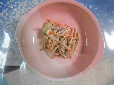④ゆでたごぼう、にんじんとさきいか、きゅうりを入れて、マヨネーズ、うすくちしょうゆ、白すりごまで和えてできあがり。
