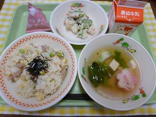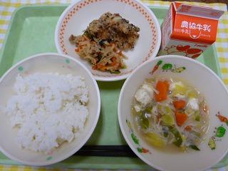 ごはん、とり野菜、竹輪のごま揚げ、切干のピリ辛炒め、牛乳です。
