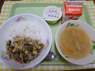 ナッツ入りガパオライス(風)、オニオンスープ、