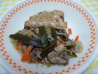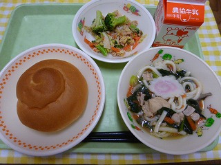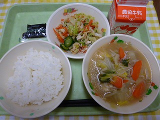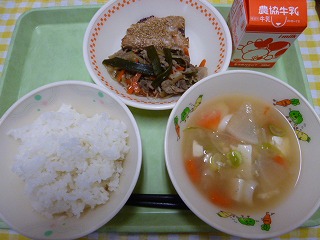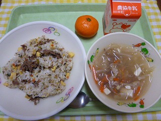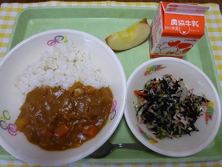 ポークカレー、ひじきのマリネ、フルーツ、牛乳です。