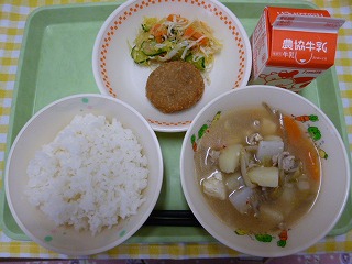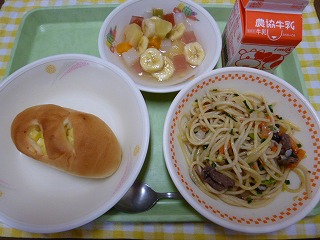 チーズクッペ、和風スパゲティー、フルーツカクテル、牛乳です。