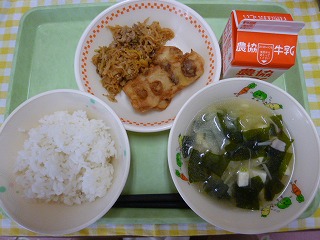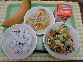 わかめごはん、卵とじ、キャベツのごま酢和え、メロン、牛乳です。