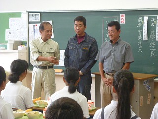 給食時間には、生産者の辻さん(辻組)、岩崎さん(協建設)、