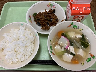 ごはん、なすの肉みそ炒め、具沢山汁、牛乳です。