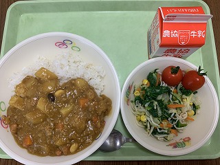 ビーンズカレー、ポパイサラダ、ミニトマト、牛乳です。