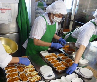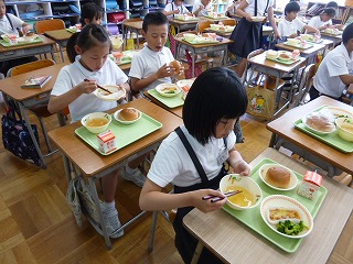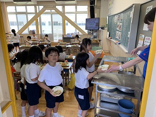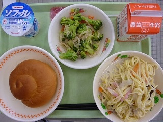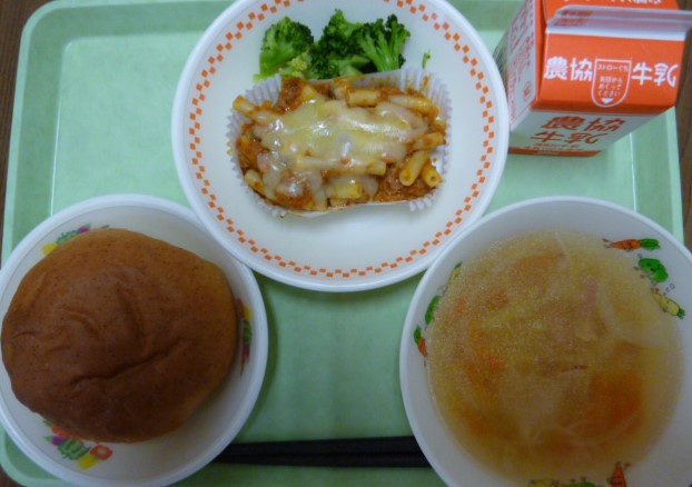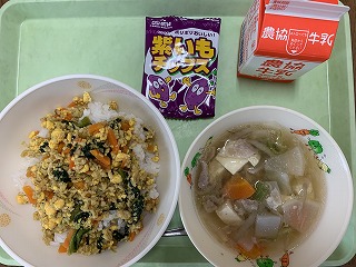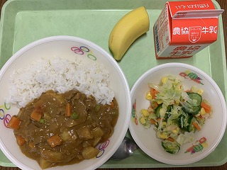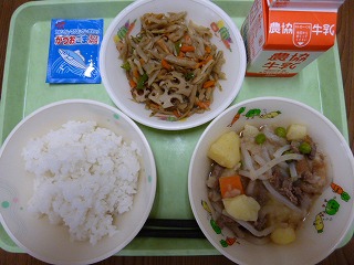 ごはん、肉じゃが、きんぴらごぼう、ふりかけ、牛乳です。