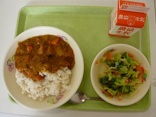 かぼちゃカレー、野菜サラダ、牛乳です。