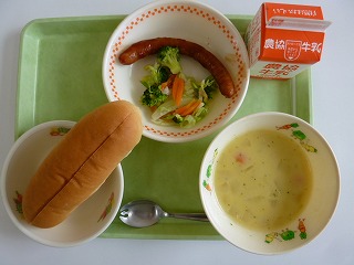 コーンスープ、フルーツ、牛乳です。