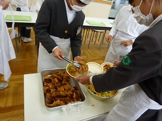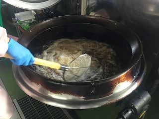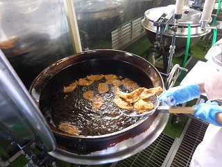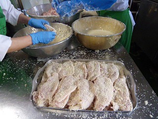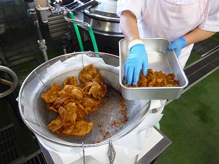 給食室で衣を付けて揚げました。