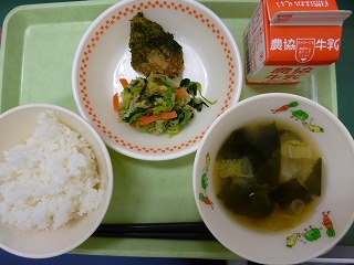 ごはん、サバのかば焼き風、おひたし、みそ汁、牛乳です。