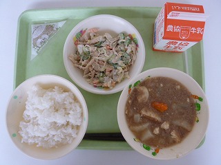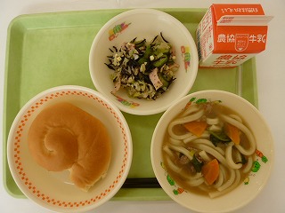 ミルクロールパン、肉うどん、ひじきサラダ、牛乳です。