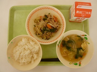 ごはん、豚肉の生姜炒め、ビーフンスープ、牛乳です。