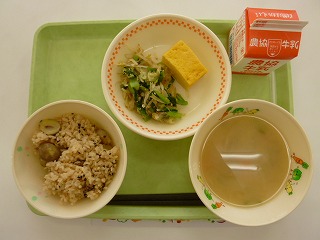 栗ごはん、卵焼き、ごま和え、みそけんちん汁、牛乳です。